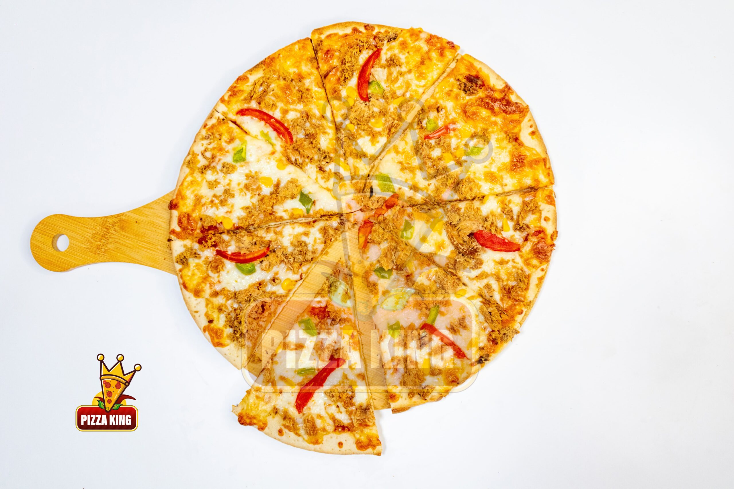 Crust, Pizza Sauce/ Royal Sauce, Tuna, Green Pepper, Sweet Corn, Tomatoes, Cheese.